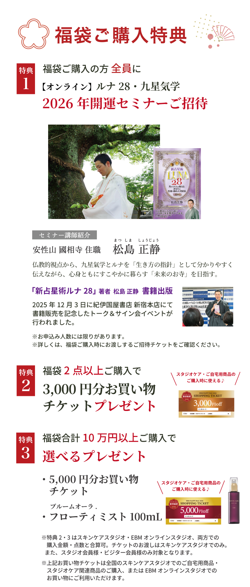 HOME > スタジオキャンペーン > スタジオキャンペーン 2026福袋[hccp] 2026年1月7日 EBMオンラインスタジオにログインしてご覧ください。ログインしていない場合、会員様・ビジター様限定福袋は表示されません。 1月1日よりすべての福袋 販売開始♪ スライドして右へ▶︎▶︎ ご購入はこちら スライドして右へ▶︎▶︎ スライドして右へ▶︎▶︎ 毛穴・ニキビ ハリ・たるみ・エイジング シミ・くすみ・透明感 シワ・乾燥 ボディ・インナーケア 〜20,000円 20,001円〜50,000円 50,001円〜100,000円 100,001円〜 ログインページはこちら EBMオンラインスタジオにご登録がお済みでない場合は、まずは初回ご登録をお願いいたします。 Twitter Share Pocket Hatena LINE コピーする -スタジオキャンペーン