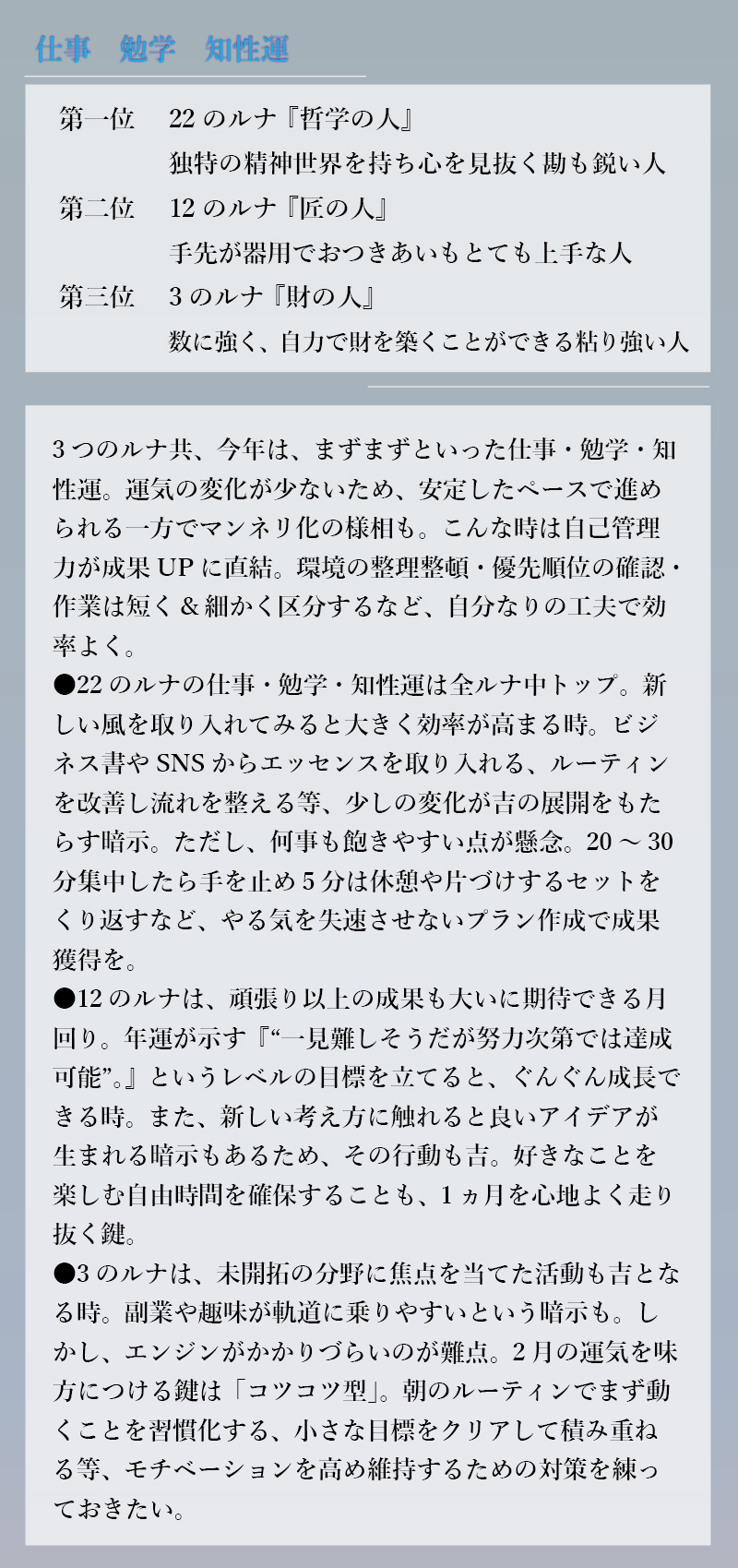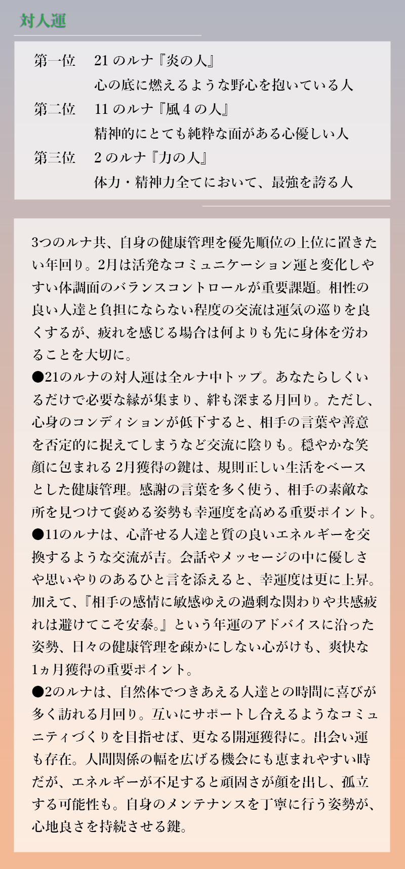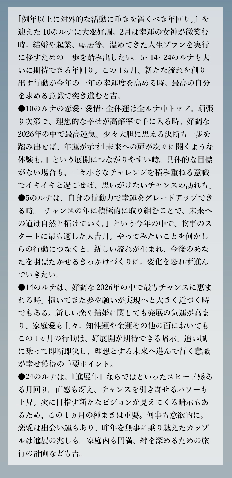 HOME > EBMレター > EBMレター 2月のラッキールナランキング 2026年1月28日 …気になる続きはコチラから↓ ◇◆webサイト【新占星術ルナ28】にて◆◇ ◆◇あなたのルナをお調べいただけます◇◆ ◎今日の運勢◎あなたの金運◎あなたの恋愛・結婚◎吉凶カレンダー◎相性診断など、コンテンツも充実♪ https://luna28.jp/ へアクセス! EBMのスキンケアスタジオでもお調べできます。 皆様のご来店を心よりお待ちしております。 次回の【EBMレター】もお楽しみに! Twitter Share Pocket Hatena LINE コピーする -EBMレター