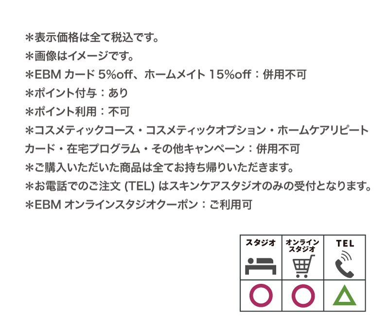2月 27日・28日・29日 の3日間は、 ホームケアご購入ポイントが2倍! 店頭でのお買い物はもちろん、 EBMオンラインスタジオでの お買い物もポイント付与の対象に♪ 貯まったポイントは1ポイントを 1円と換算し、 お好きなホームケア商品もしくは コースのご購入金額のお値引きに ご利用いただけます。 ※EBMオンラインスタジオで商品を購入された場合、ホームケアポイントの反映は商品ご購入日から8日後(ご購入日含む)となります。 EBMオンラインスタジオをチェック 3月が目前に迫り、春の兆しを感じる日も増 ...